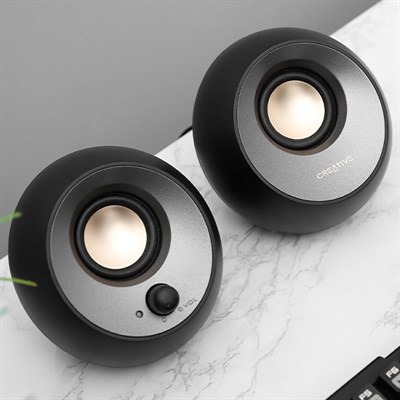 Khác với Creative Pebble Plus một chút, Creative Pebble V2 chỉ có hai loa vệ tinh hình cầu cắt xéo phù hợp với các không gian làm việc nhỏ, cần sự tối giản. Bên cạnh đó thì với thiết kế nhỏ gọn như thế này cũng giúp bạn dễ dàng mang theo khi đi ra ngoài hơn.